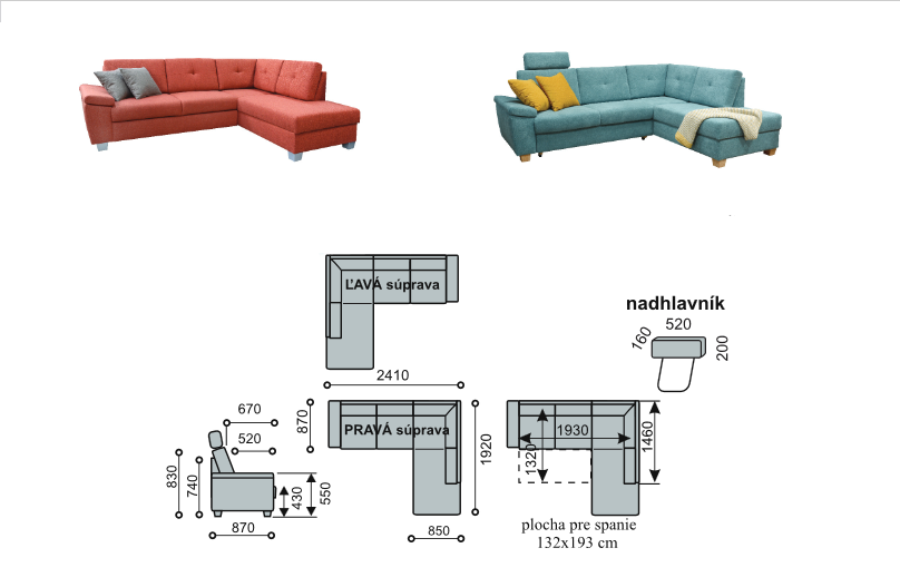 Sedací souprava se vyrábí v levém i pravém provedení.