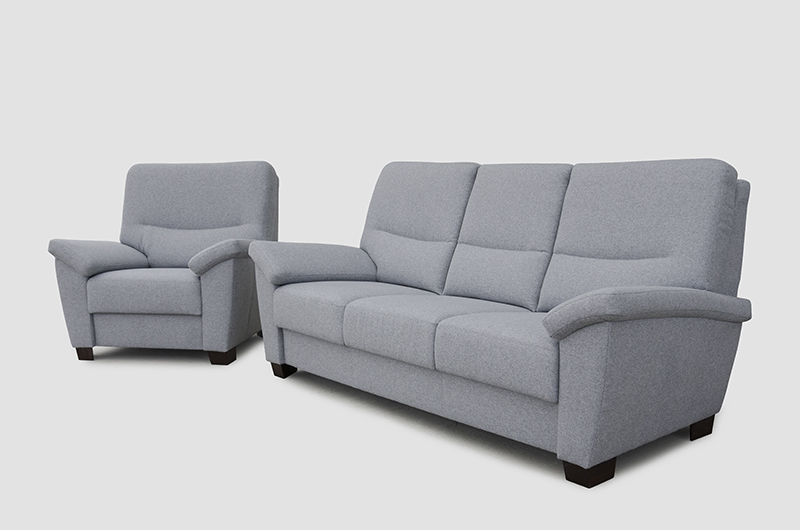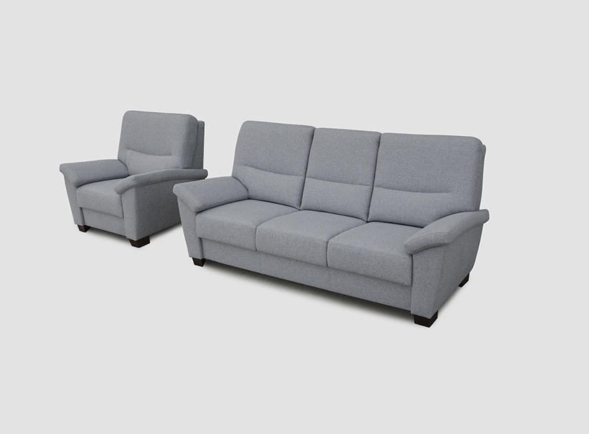 Sedací souprava klasických proporcí s vyšším opěradlem.