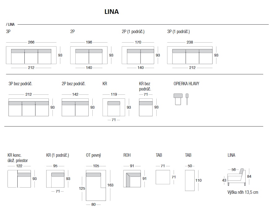 Moderní a elegantní sektorová sedací souprava s pevnými polštáři a na chromových nožičkách. Vhodná do každého interiéru. Ergonomické sezení. Možnost vyskládání soupravy dle přání zákazníka. Sedací souprava LINA nemá možnost rozkládacího lůžka ani úložného prostoru. Pro vyšší komfort sezení je možné si doobjednat opěrku hlavy.